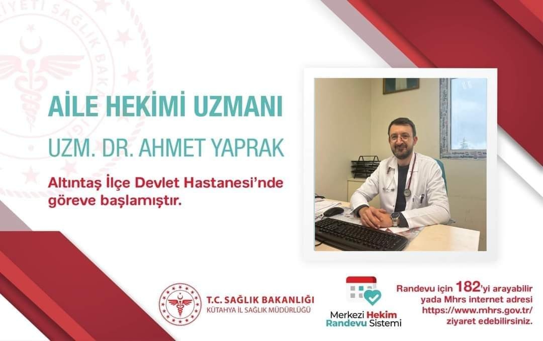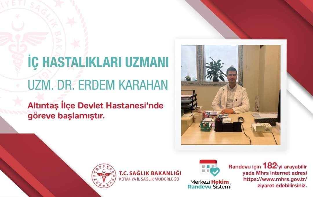 Altıntaş İlçe Devlet Hastanemizde İç Hastalıkları (Dahiliye) Uzmanı,Uzm.Dr.Erdem Karahan ve Aile Hekimi Uzmanı, Uzm.Dr.Ahmet Yaprak hasta kabulüne başlamışlardır. Hekimlerimize görevlerinde başarılar diliyoruz. Altıntaş'ımıza Hayırlı Olsun. MHRS üzerinden ve 182 den randevu alabilirsiniz.