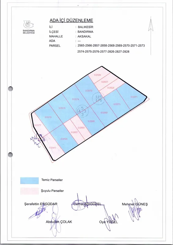 Bandırma Belediyesi Encümeni, 21 Ocak 2026 tarihli ve 66 sayılı kararı ile Aksakal Mahallesi'nde bulunan 2565, 2566, 2857, 2858, 2568, 2569, 2570, 2571, 2573, 2574, 2575, 2576, 2577, 2826, 2827 ve 2828 numaralı parsellere ait ada içi düzenleme planının onaylanmasına oybirliği ile karar verdi.