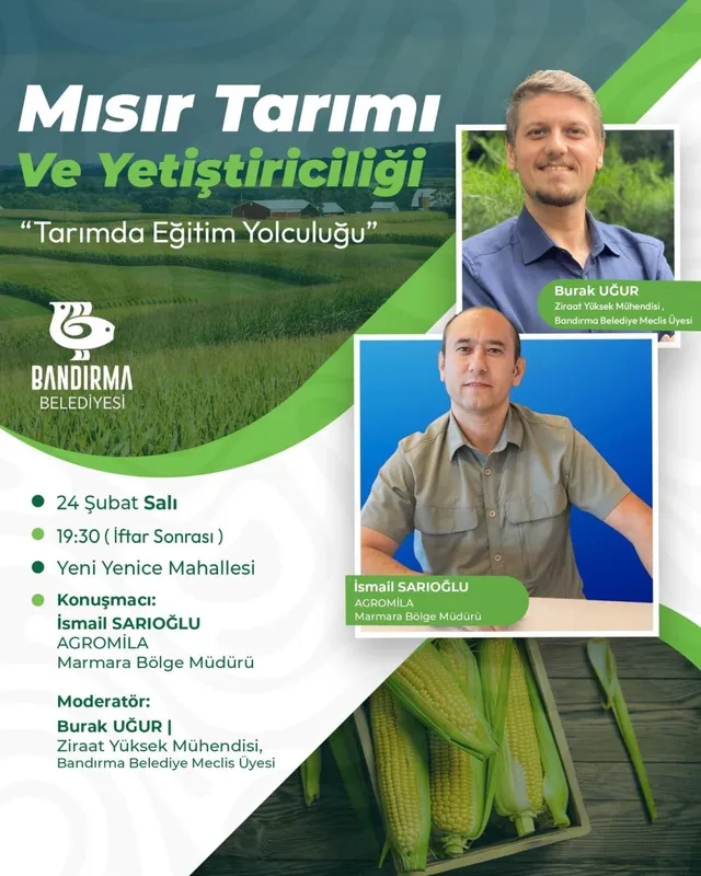 Alanında uzman isimlerin konuşmacı olarak katılacağı "Mısır Tarımı ve Yetiştiriciliği" konulu eğitimde, mısır üretimine dair önemli bilgi ve deneyimler katılımcılarla paylaşılacak.