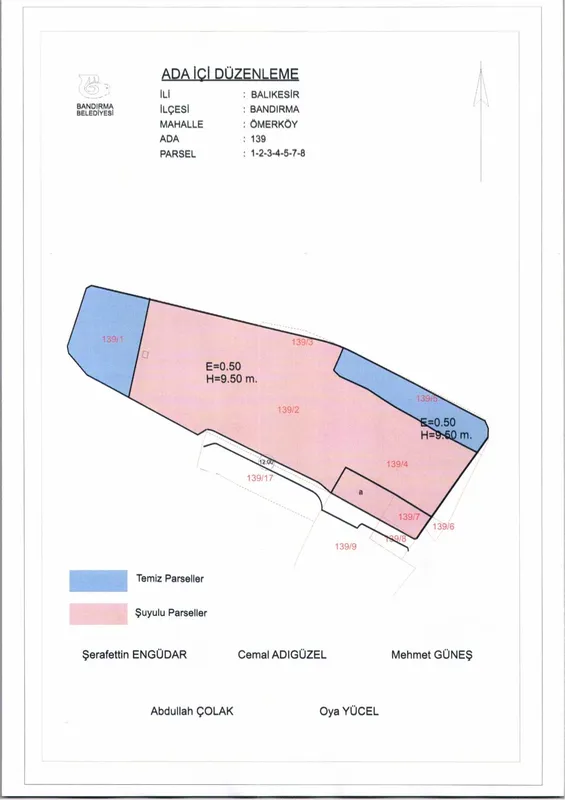 Bandırma Belediyesi Encümeni, 18 Şubat 2026 tarihli ve 169 sayılı kararı ile Ömerli Mahallesi, 139 ada, 1, 2, 3, 4, 5, 7 ve 8 numaralı parsellere ait ada içi düzenlemesinin onaylanmasına karar verdi.