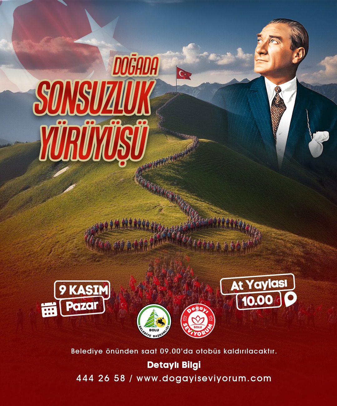 Bolu Belediyesi, Gazi Mustafa Kemal Atatürk'ün 87. ölüm yıl dönümü dolayısıyla "Doğada Sonsuzluk Yürüyüşü" düzenliyor. 9 Kasım Pazar günü At Yaylası'nda gerçekleştirilecek yürüyüşe tüm Bolu halkı davet edildi.