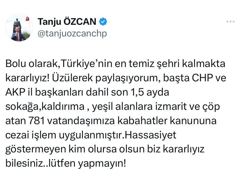 Bolu Belediye Başkanı Tanju Özcan, yere çöp ve izmarit atan 781 kişiye cezai işlem uygulandığını açıkladı. Özcan, sosyal medya hesabından konuya ilişkin yaptığı bilgilendirmede, “Bolu olarak, Türkiye’nin en temiz şehri olmakta kararlıyız! Üzülerek paylaşıyorum, başta CHP ve AKP İl Başkanları dâhil son 1,5 ayda sokağa, kaldırıma, yeşil alanlara izmarit ve çöp atan 781 vatandaşımıza kabahatler kanununa göre cezai işlem uygulanmıştır. Hassasiyet göstermeyen kim olursa olsun biz kararlıyız, bilesiniz. Lütfen yapmayın!” ifadelerini kullandı.
