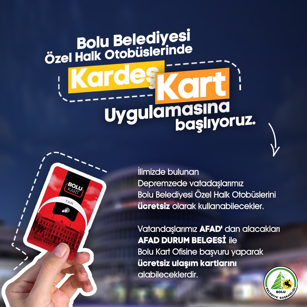 Kahramanmaraş merkezli 10 ili etkileyen büyük depremlerin ardından tüm imkânlarını depremzedeler için seferber eden Bolu Belediye Başkanı Tanju Özcan, Bolu’ya sığınan depremzedeleri de unutmadı. Başkan Özcan’ın talimatıyla depremden sağ kurtularak Bolu’ya yerleşen depremzedeler için ‘Kardeş Kart’ uygulaması hayata geçirildi. Bolu Belediye Meclisi’nin Şubat Ayı 2’nci birleşiminde alınan karar göre; 1 Mart 2023 tarihinden itibaren Bolu’da yaşayan AFAD’a kayıtlı yaklaşık 5 bin depremzede Bolu Belediyesi Özel Halk Otobüslerini mesire alanları hariç ücretsiz kullanabilecek.