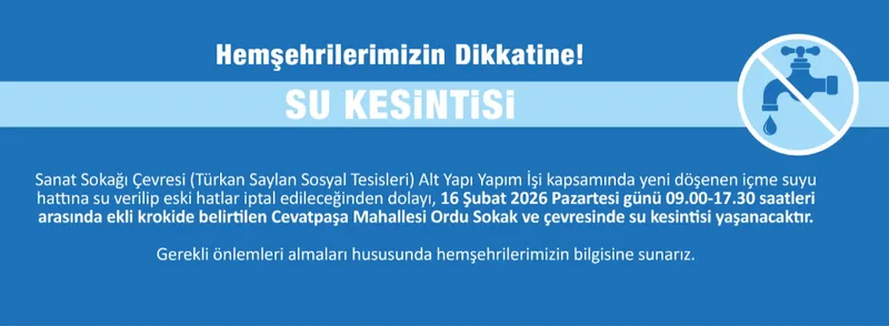 Su kesintisi, 16 Şubat 2026 Pazartesi günü, saat 09.00 ile 17.30 arasında uygulanacak. Kesintiden etkilenecek ana bölge, Cevatpaşa Mahallesi'ndeki Ordu Sokak ve hemen çevresindeki alanlar olarak açıklandı. Belediye, çalışmaların belirtilen saatler arasında tamamlanmasını hedefliyor.