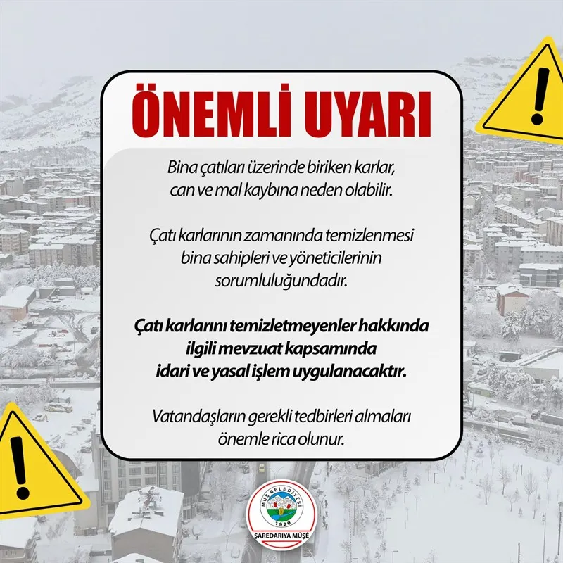 Çatı karlarını temizletmeyen bina sahipleri ve yöneticileri hakkında yasal işlem başlatılacak. İlgili kanun ve yönetmelikler kapsamında, idari para cezası uygulanması öngörülüyor. Bu tedbir, olası kazaların önlenmesi amacıyla hayata geçiriliyor.