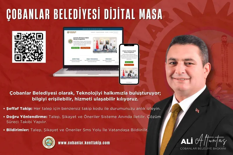 Belediyenin Dijital Masa sistemi, vatandaşların talep, şikayet ve önerilerini https://www.cobanlar.kenttakip.com/ adresi üzerinden anında iletmesine ve çözüm sürecini takip etmesine olanak tanıyor.