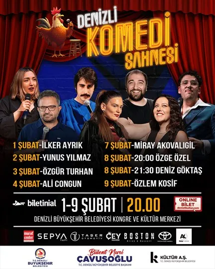 Denizli Büyükşehir Belediyesi Kültür AŞ tarafından düzenlenen Denizli Komedi Sahnesi, 1–9 Şubat tarihleri arasında her gün farklı bir komedyeni sahnesinde ağırlayacak. Etkinlik, kenti mizah ve eğlencenin merkezi haline getirmeyi hedefliyor.