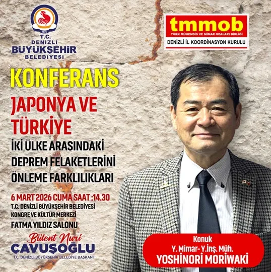 1-7 Mart Deprem Haftası kapsamında, afet bilincini artırmak ve toplumsal farkındalığı güçlendirmek amacıyla Denizli'de bir konferans organize ediliyor. Denizli Büyükşehir Belediyesi Afet İşleri ve Risk Yönetimi Dairesi Başkanlığı'nın koordinasyonunda düzenlenecek etkinlikte, Japonya'nın deprem yönetimi ve afet hazırlık deneyimleri ile Türkiye'deki uygulamalar karşılaştırmalı olarak değerlendirilecek.