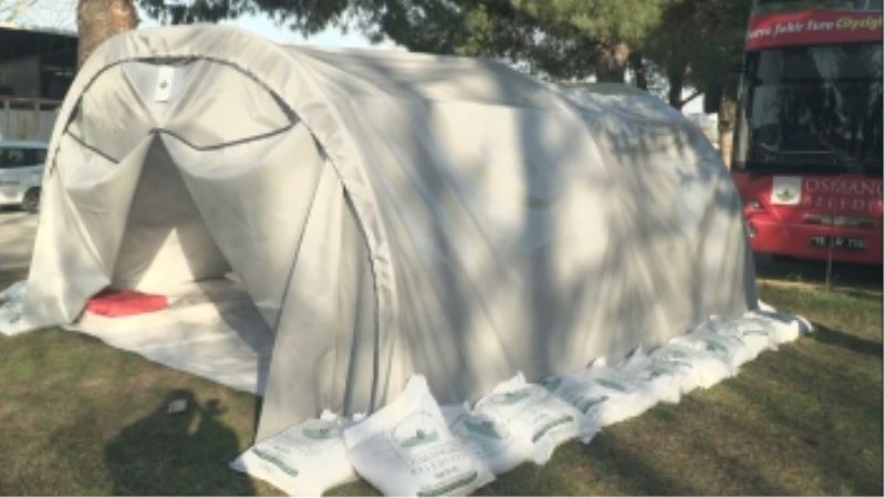 Osmangazi Belediyesi, asrın felaketinin ardından ortaya çıkan barınma ihtiyacını karşılamak adına bölgeye konteynerlerin ardından şimdi de 100 çadır gönderiyor.
