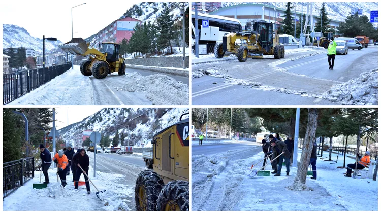 Gümüşhane Belediyesi ekipleri, il genelini etkisi altına alan sert kış koşullarına karşı kar ve buz temizleme operasyonlarını aralıksız sürdürüyor. Yoğun kar yağışı ve buzlanmanın yol açtığı zorluklarla mücadele eden ekipler, kentte hayatın durmaması için çaba harcıyor.