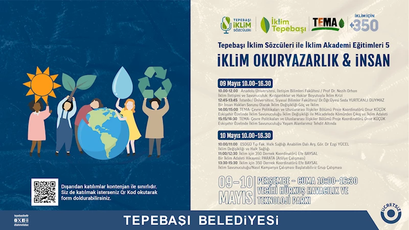 Eğitim, 9 Mayıs Perşembe günü ve 10 Mayıs Cuma günü 10.00-16.30 saatleri arasında Tepebaşı Belediyesi Vecihi Hürkuş Havacılık ve Teknoloji Parkı’nda gerçekleştirilecek. Öte yandan yetkililer, dışarıdan katılımların kontenjan ile sınırlı olduğunu belirterek, eğitime katılmak isteyenlerin ise afişte yer alan QR Kodu okutarak veya https://tinyurl.com/iklimakademi5 linki üzerinden başvuru formuna ulaşabileceklerini bildirdi.