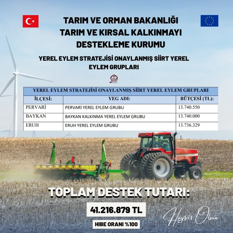 Pervari, Baykan ve Eruh ilçelerinde kurulan Yerel Eylem Grubu (YEG) Dernekleri tarafından hazırlanan yerel kalkınma stratejileri onaylandı. Söz konusu dernekler, Tarım ve Kırsal Kalkınmayı Destekleme Kurumu (TKDK) ile sözleşme imzalamaya hak kazandı.