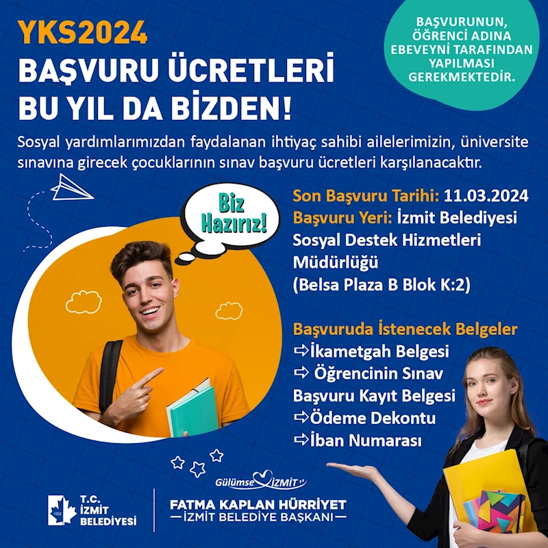 İzmit Belediyesi, Yükseköğretim Kurumları Sınavına (YKS) girecek olan ve Sosyal Destek Hizmetleri Müdürlüğü’nün sosyal yardımlarından düzenli şekilde faydalanan ihtiyaç sahibi öğrencilerin sınav giriş ücretlerini karşılayacak.