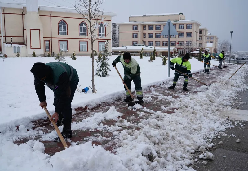 Kar yağışının etkili olduğu saatlerde araç ulaşımı için yürütülen kar küreme ve tuzlama çalışmaları, gündüz saatlerinde yaya ulaşımını kolaylaştırmak için devam ediyor. Ekipler, gece boyunca da Afet Koordinasyon Merkezi (AKOM) koordinesinde araç trafiğinin güvenliğini sağlamak için sahada görev yaptı.