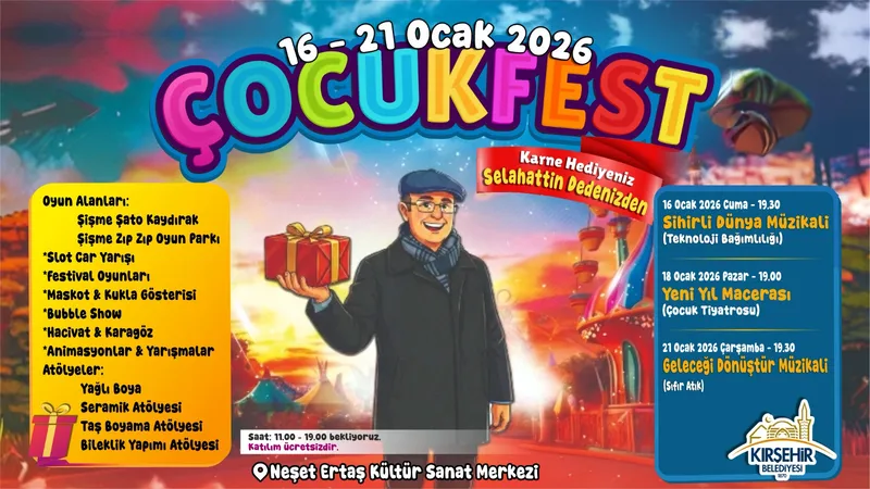 Kırşehir Belediyesi, 2025-2026 eğitim-öğretim yılının ilk yarısının sonunda 'ÇocukFest' adını verdiği bir çocuk festivali düzenleyecek. Ücretsiz etkinlikler, 16-21 Ocak tarihleri arasında Neşet Ertaş Kültür Sanat Merkezi'nde 11.00-19.00 saatlerinde gerçekleşecek.