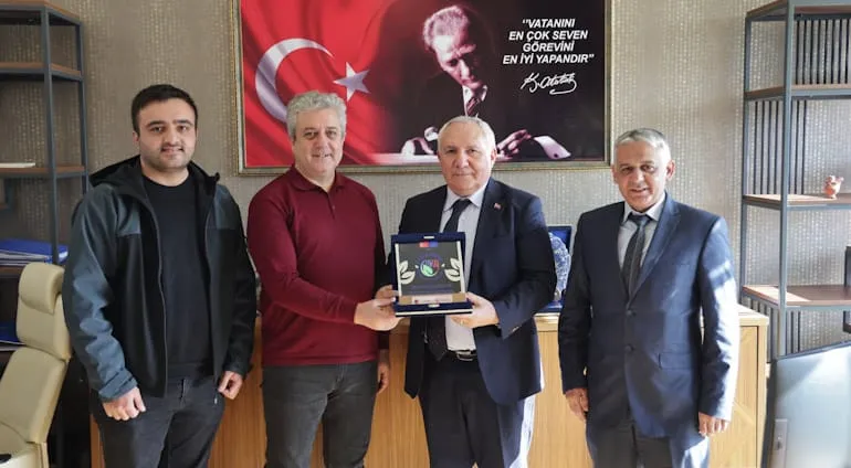 İklim Değişikliği ve Sıfır Atık Müdürü Rıdvan Yavuz'un katıldığı bir görüşmede, Etüt Mühendisi Mert Özdemir ve Bölge Sorumlusu Aydıner Tahan, yürütülen başarılı çalışmaların anısına Belediye Başkan Yardımcısı Ejderhan Gezer'e bir plaket sundu.
