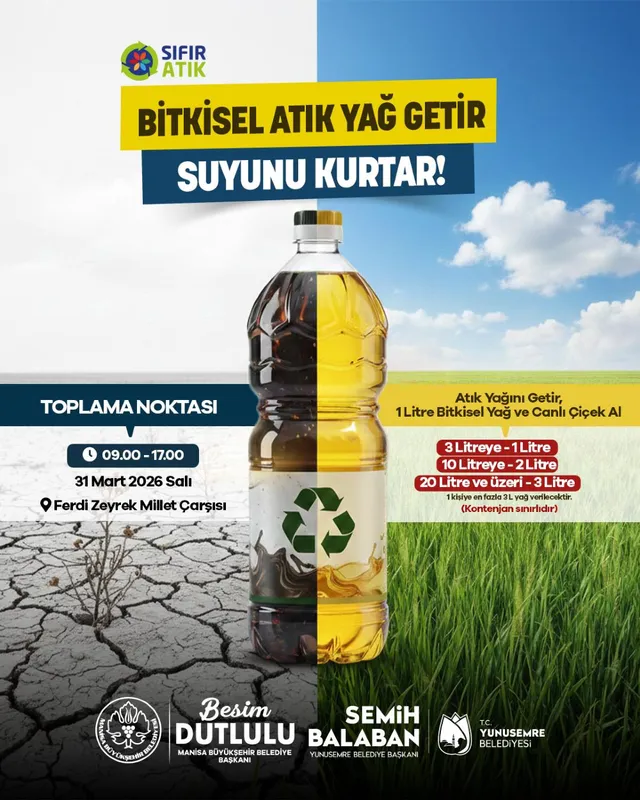 Manisa Büyükşehir Belediyesi ve Yunusemre Belediyesi, gelecek nesillere daha temiz bir çevre bırakmak amacıyla ortak bir proje başlattı. 'Sıfır Atık' vizyonu kapsamında hayata geçirilen kampanyada, evsel bitkisel atık yağların toplanarak çevre kirliliğinin önlenmesi ve ekonomiye geri kazandırılması hedefleniyor.