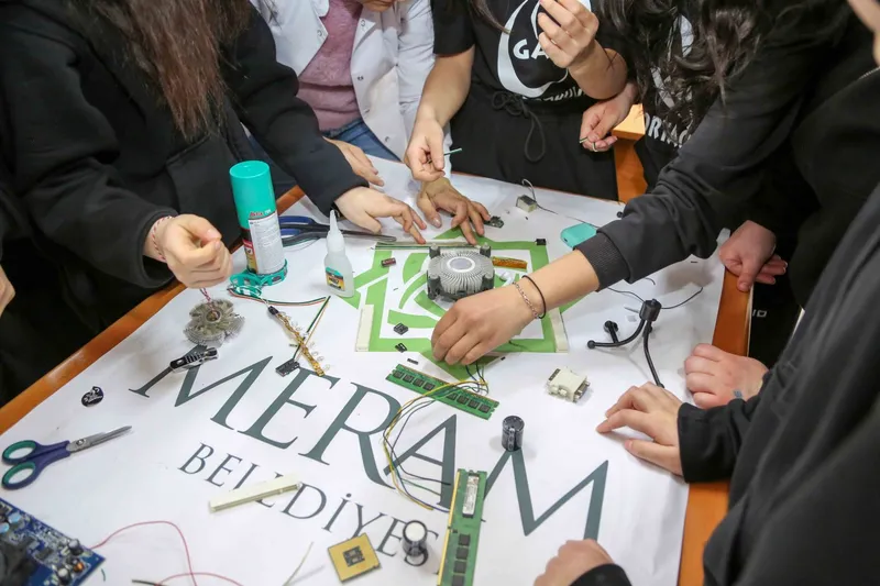 Eğitimde, kullanılmayan elektronik eşyaların geri dönüşüme kazandırılmasının önemi vurgulandı. Programın dikkat çeken bölümü ise atölye çalışması oldu. Öğrenciler, toplanan elektronik atık parçalarını kullanarak Meram Belediyesi logosunu yeniden şekillendirdi. Kablolar, devre kartları ve metal parçalardan oluşturulan çalışma, geri dönüşümün üretken bir süreç olduğunu gösterdi.