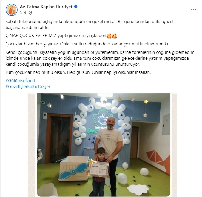 Kendi çocuğumu siyasetin yoğunluğundan büyütemedim, karne törenlerinin çoğuna gidemedim, içimde uhde kalan çok şeyler oldu ama tüm çocuklarımızın geleceklerine yatırım yaptığımızda kendi çocuğumla yaşayamadığım yıllarımın üzüntüsünü unutturuyor. Tüm çocuklar hep mutlu olsun. Hep gülsün. Onlar hep iyi olsunlar inşallah” ifadelerini kullandı.