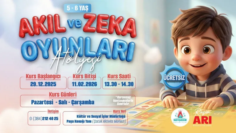 Nevşehir Belediyesi, 5-6 yaş grubundaki çocukların gelişimine katkı sağlamak amacıyla Akıl ve Zekâ Oyunları Atölyesi düzenlemeye hazırlanıyor. Belediyenin Kültür, Sanat ve Sosyal İşler Müdürlüğü tarafından organize edilecek bu özel atölye, çocukların zihinsel ve fiziksel gelişimlerini desteklemeyi hedefliyor.