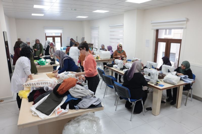 Nevşehir Belediyesi Kadın ve Aile Hizmetleri Müdürlüğü bünyesindeki Kadın Çalışmaları Eğitim Merkezi içerisinde bulunan atölyeleri kullanan kadınlar, hayırseverce karşılanan ve kendi evlerinden getirdikleri kumaş ve polar ile depremzedeler için atkı, bere, pijama, kıyafet, bebek kıyafetleri, çarşaf, yorgan ve yastık dikimi yapıyor.