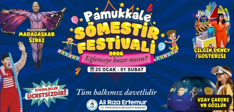 Pamukkale Belediyesi, 2026 yılı yarıyıl tatilinde çocuklar ve aileler için “Pamukkale Sömestir Festivali” düzenleyecek. 25 Ocak – 1 Şubat 2026 tarihleri arasında gerçekleşecek festivalde tiyatrodan sirke, animasyon filmlerinden bilim ve deney gösterilerine kadar çok sayıda ücretsiz etkinlik yer alacak.