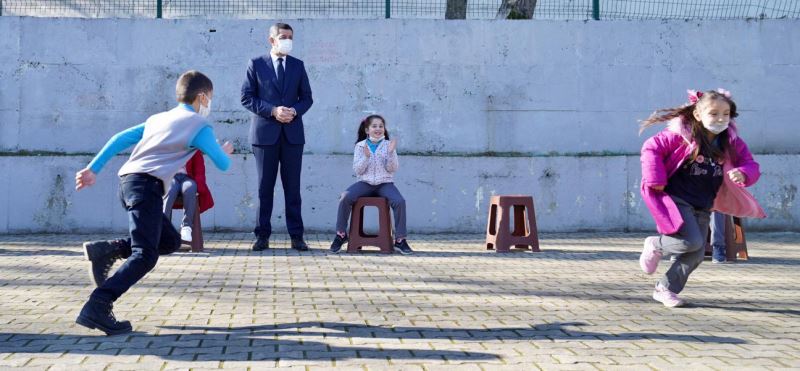 Bakan Selçuk, bahçede "temassız oyun" oynayan çocukları bir süre izledikten sonra okuldan ayrıldı.