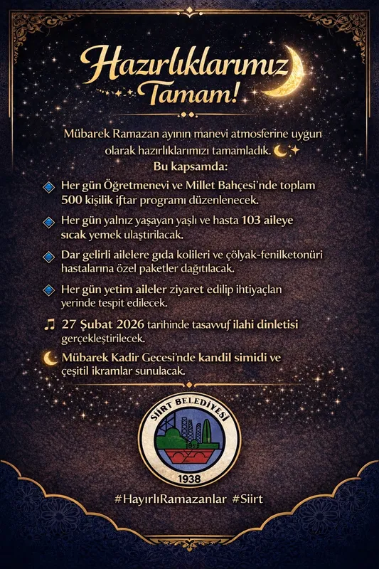 Siirt Belediyesi, Ramazan ayı için yapılan tüm hazırlıkların tamamlandığını duyurdu. Vali ve Belediye Başkan Vekili Dr. Kemal Kızılkaya'nın talimatlarıyla, Kültür ve Sosyal İşler Müdürlüğü koordinasyonunda geniş kapsamlı bir program hayata geçirildi.