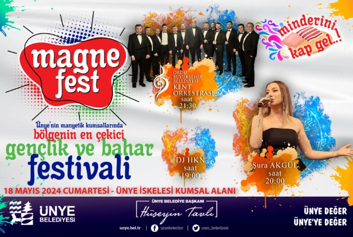 Ünye Belediye Başkanı Hüseyin Tavlı, MAGNEFEST Gençlik ve Bahar Festivali ile ilgili yaptığı açıklamada “19 Mayıs Atatürk’ü Anma Gençlik ve Spor Bayramı vesilesi ile geleneksel hale getirdiğimiz festivalimizin bu yıl 3’ncüsünü gerçekleştirmiş olacağız. Ünye’mizin manyetik kumsallarını da içine kattığımız, aynı zamanda Mayıs yedisi olarak bildiğimiz geleneksel ritüelimizi de dâhil ettiğimiz bir festivali düzenlemiş oluyoruz. Bölgenin en farklı festivali olan Geleneksel MAGNEFEST Gençlik ve Bahar Festivalimize herkesi davet ediyorum” dedi.