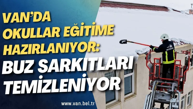 Van'da geçtiğimiz hafta etkili olan kar yağışı nedeniyle eğitime verilen arada, Van Büyükşehir Belediyesi İtfaiyesi okul çatılarında tehlike oluşturan buz sarkıtlarını temizledi.