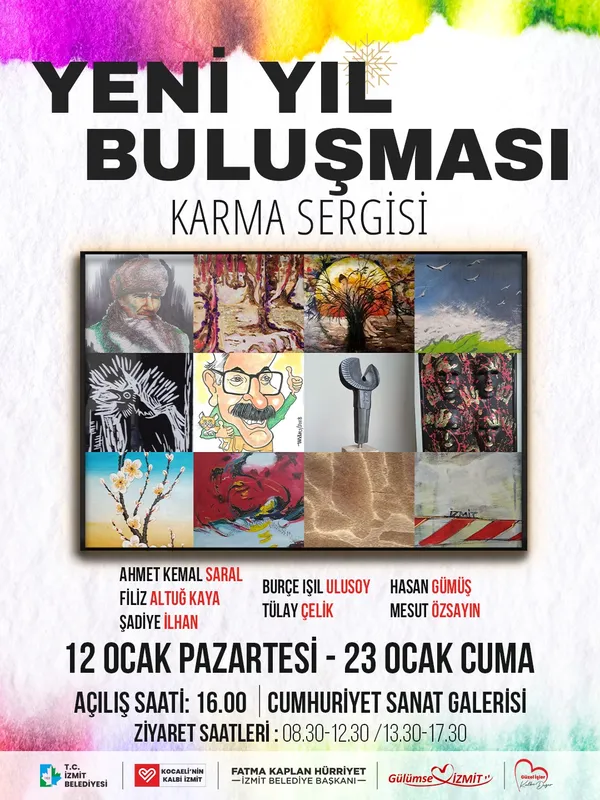 İzmit Belediyesi Cumhuriyet Sanat Galerisi’nde 12 Ocak Pazartesi günü saat 16.00’da açılacak olan “Yeni Yıl Buluşması” Karma Sergisi, yedi sanatçının yaklaşık 70 eserden oluşan çağdaş seçkisiyle 23 Ocak Cuma’ya kadar ziyaret edilebilecek.