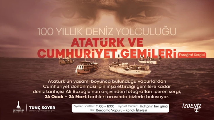 Büyük Önder Mustafa Kemal Atatürk’ün denizlerde bağımsızlığa ve denizciliğe verdiği önemi anlatan “100 Yıllık Deniz Yolculuğu: Atatürk ve Cumhuriyet Gemileri Fotoğraf Sergisi”, İZDENİZ A.Ş.’nin organizasyonuyla 24 Ocak’tan itibaren İzmirlilerle buluşacak.