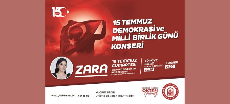 Yıldırım Belediyesi, 15 Temmuz hain darbe girişiminin 7’inci yıl dönümünde, anlamlı etkinliklere imza atacak. Yıldırım Belediyesi Bayrak Alanı’nda düzenlenecek etkinlikler 15 Temmuz Cumartesi akşamı saat 20.30’da ‘Türkiye Benim’ sahne gösterisi ile başlayacak. Program kapsamında ünlü sanatçı Zara da saat 21.00’de sahne alacak.