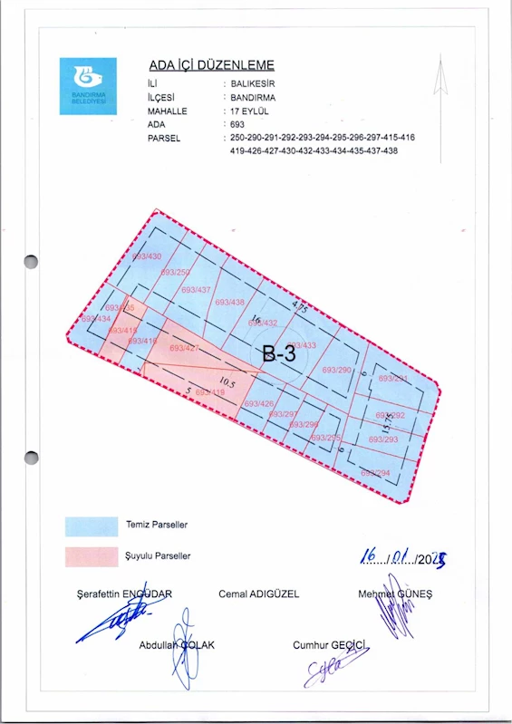 Belediye Encümeninin 22.01.2025 tarih ve 57 sayılı Encümen kararı ile 17 Eylül Mahallesi, 693 ada 250-290-291-292-293-294-295-296-297-415-416-419-426-427-430-432-433-434-435-437-438 nolu parsellere ait ada içi düzenlemesinin, 1/1000 ölçekli Bandırma Uygulama İmar Planı notlarının 137. Maddesi ve 3194 sayılı İmar Kanununun 19. maddesi gereği onaylanmasına,