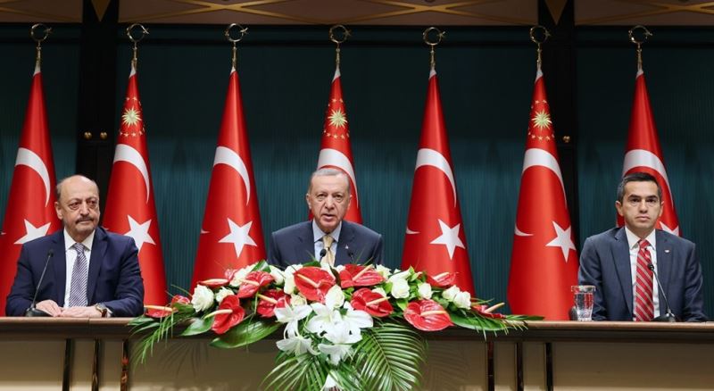 Geçmiş yıllarda da taraflar uzlaşmaya varamadığı zamanlarda hükümetçe sonuçlandırılan çok sayıda asgari ücret müzakeresi olduğunu anımsatan Erdoğan, “Açıklayacağımız asgari ücret rakamı ülkemizin genel ekonomik ve sosyal görünümüyle de uyumludur. Türkiye’de, yatırım, istihdam, üretim, ihracat ve cari fazla yoluyla büyüme gayretlerimizin en somut sonuçlarını çalışma hayatında aldığımız bir gerçektir. Bugün ülkemiz 34,7 milyonluk iş gücüne karşılık 31,6 milyonluk istihdamla tarihin en yüksek çalışan rakamına ulaşmıştır. Üstelik bu seviye kadınlarımızın iş gücüne katılımının rekor kırdığı bir dönemde yakalanmıştır. Küresel krizin gelişmiş ülkeleri dahi ciddi şekilde sarstığı bir süreçte, Türkiye’nin kalkınmasını artırarak sürdürmesi tüm dünyada ilgiyle takip edilmektedir. Ülkemizin elde ettiği her kazanımı 85 milyon vatandaşımızın tamamının hayat kalitesini yükseltmek için kullanıyoruz. Çalışma hayatında sosyal yardımlara, yatırımların teşvikinden sanayi ve tarım üretiminin desteklenmesine kadar her alanda bu gayretin izlerini ve neticelerini görmek mümkündür” diye konuştu.