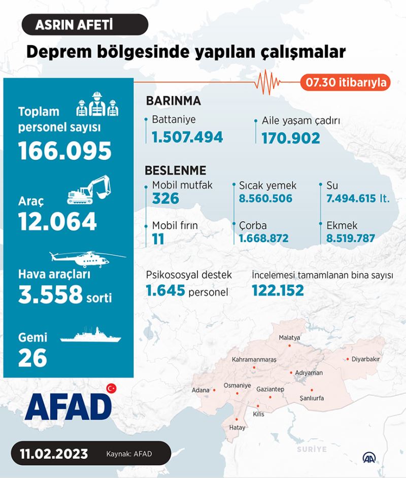 Kahramanmaraş, Gaziantep, Şanlıurfa, Diyarbakır, Adana, Adıyaman, Osmaniye, Hatay, Kilis, Malatya ve Elazığ'daki can kaybı 20 bin 665 oldu, 80 bin 88 kişi de kurtarıldı. Depremden etkilenen illerden 92 bin 697 afetzede tahliye edildi.