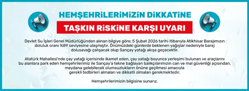 Yetkililer, özellikle Atatürk Mahallesi'nde çay yatağı içinde ikamet eden veya bu alanlarda yerleşimi bulunan vatandaşları uyardı. Ayrıca, bölgede araçlarını park edenler ile Sarıçay'a tekne bağlayan balıkçılar da can ve mal güvenlikleri için acilen gerekli tedbirleri almak ve dikkatli olmak konusunda bilgilendirildi. Bu uyarılar, meydana gelebilecek olumsuzlukların önüne geçmeyi amaçlıyor.