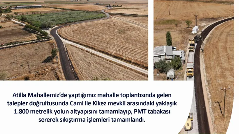 Atilla Mahallemiz’de yaptığımız mahalle toplantısında gelen talepler doğrultusunda Cami ile Kikez mevkii arasındaki yaklaşık 1.800 metrelik yolun altyapısını tamamlayıp, PMT tabakası sererek sıkıştırma işlemleri tamamlandı. Fen İşleri Müdürlüğümüzün sathi asfalt kaplama çalışmasıyla yolumuzu halkımızın hizmetine sunduk.