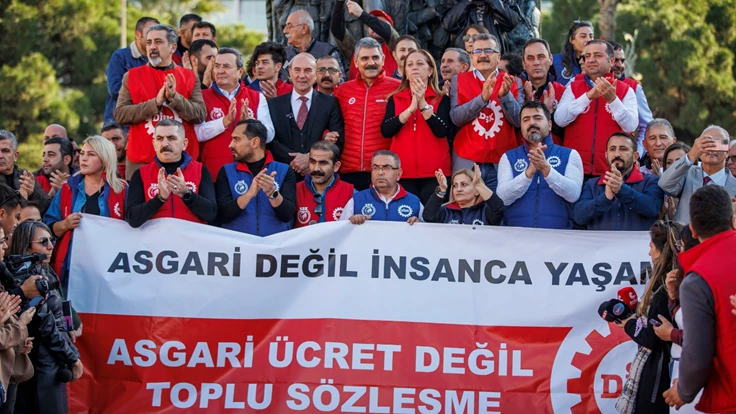 Devrimci İşçi Sendikaları Konfederasyonu (DİSK) Genel-İş Sendikası İzmir şubelerine üye işçiler, vergide adalet ve asgari ücrete yönelik taleplerini dile getirmek için sahaya indi. Düzenlenen yürüyüşe İzmir Büyükşehir Belediye Başkanı Tunç Soyer, DİSK Genel Başkanı Arzu Çerkezoğlu, Genel İş Genel Başkanı Remzi Çalışkan, DİSK Ege Bölge Temsilcisi Memiş Sarı, sendika yöneticileri, sivil toplum örgütleri ve işçiler katıldı. Montrö Meydanı’ndan ellerinde döviz ve pankartlarla Cumhuriyet Meydanı’na kadar yürüyen işçiler, “Zafer direnen emekçinin olacak”, “Birleşe birleşe kazanacağız” sloganları attı. İşçiler ayrıca asgari ücrete yönelik zam taleplerinin dikkate alınmamasına, taşıdıkları temsili bir tabutla tepki gösterdi.
