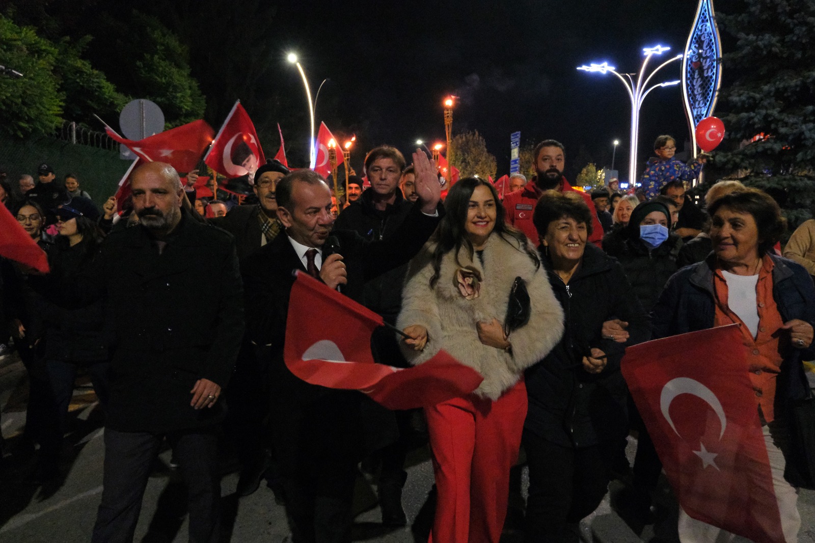 Kalabalığa Bolu Belediye Başkanı Tanju Özcan ve eşi Meral Özcan da eşlik etti. Özcan, eline aldığı mikrofonla halkı selamlayarak bayramlarını kutladı. Yürüyüş güzergâhında bulunan apartman ve iş yerlerindeki vatandaşlar da alkışlarla korteje destek verdi. Valilik önünden başlayan yürüyüş, Karaçayır Konser Alanı'nda son buldu.