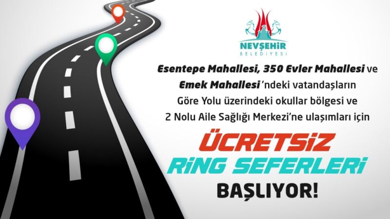 Nevşehir Belediyesi, Esentepe Mahallesi, 350 Evler Mahallesi ve Emek Mahallesi’nde ikamet eden özel halk otobüsü servis güzergâhında bulunmadığı için Göre Yolu Üzerindeki (İl Müftülüğü yanı) okullar bölgesi ve burada bulunan 2 Nolu Aile Sağlığı Merkezi’ne ulaşımda sıkıntı yaşan öğrenciler ve vatandaşlar için yeni bir düzenleme yaptı. Buna göre, hafta içi her gün Nevşehir Belediyesi tarafından bu mahallelerden okullar bölgesine ücretsiz ring seferleri gerçekleştirilecek.