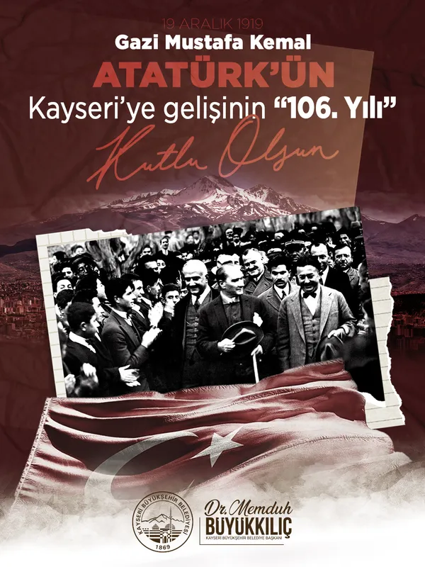 Kayseri Büyükşehir Belediye Başkanı Dr. Memduh Büyükkılıç, Cumhuriyetin kurucusu Gazi Mustafa Kemal Atatürk’ün 19 Aralık 1919’da Kayseri’ye gelişinin 106. yıl dönümü dolayısıyla bir mesaj yayımladı. Büyükkılıç, Kayseri'nin Kurtuluş Savaşı sürecindeki birlik, fedakârlık ve kararlılığıyla Cumhuriyet yolunda önemli bir durak olduğunu belirtti.
