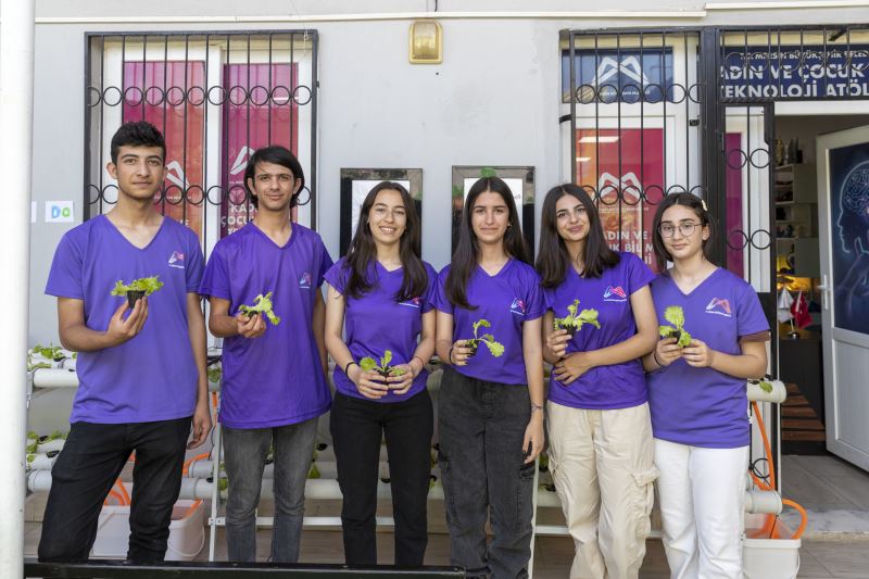 Robotik kodlama eğitimlerinden üç boyutlu tasarıma kadar, takım halinde çalışmalara imza atılan Tarsus Kadın ve Çocuk Bilim Teknoloji Atölyesi’nde, yine lise öğrencilerinin oluşturduğu gruba ‘Topraksız Tarım Uygulamaları’ öğretiliyor. Atölye Birim Sorumlusu Emre Aşkın nezaretinde yürütülen projede marul yetiştiren öğrenciler, ürünlere özenle bakıyorlar.