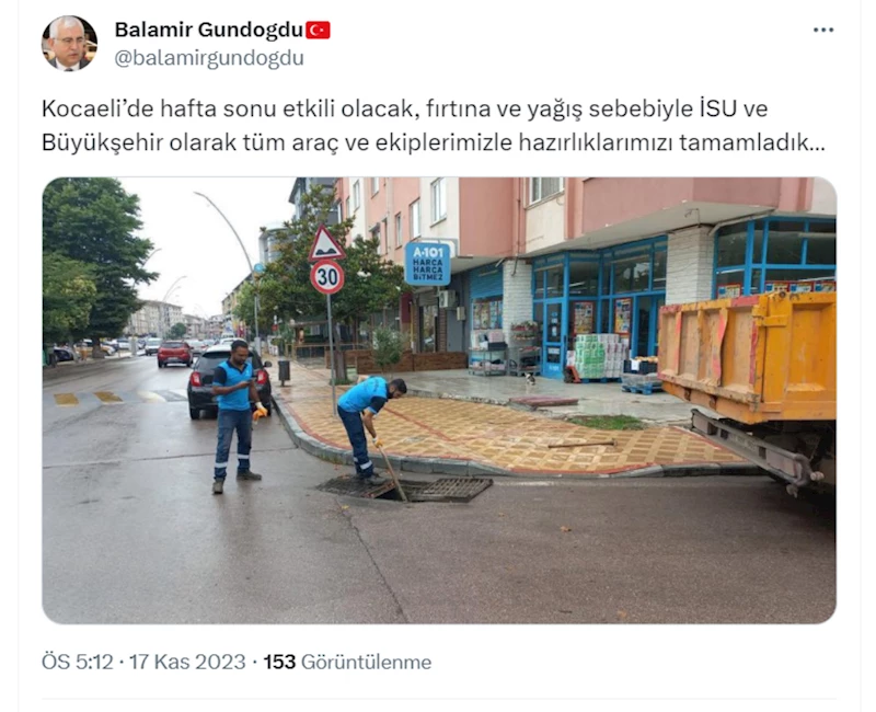 Kocaeli Valiliği’ne bağlı AFAD tarafından Meteorolojiden alınan bilgiye göre 18 Kasım Cumartesi günü sağanak yağış ve fırtına uyarısı yapıldı. Kocaeli Büyükşehir Belediyesi ve İSU Genel Müdürlüğü ekipleri de Marmara Bölgesi ve Kocaeli'yi etkisi altına alması beklenen sağanak yağış ile fırtına öncesinde hazırlıklarını tamamladı. Genel Sekreter Balamir Gündoğdu’nun talimatıyla Büyükşehir ve İSU ekipleri, 12 ilçede yağmursuyu hatları, mazgal ve ızgara temizliklerini yaparken, motopomp ve kurtarma araçlarını teyakkuza geçirdi.