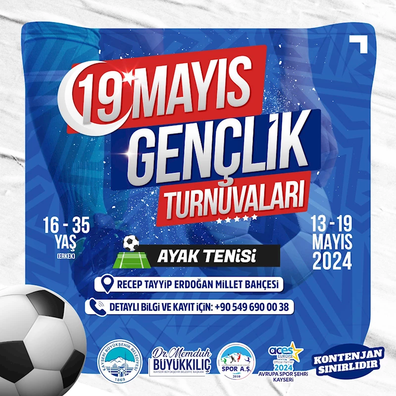 Spor A.Ş. 19 Mayıs Gençlik Turnuvaları kapsamında plaj voleybolu, basketbol, tenis ve ayak tenisi spor dallarında düzenleyeceği turnuvalarla 19 Mayıs Atatürk’ü Anma, Gençlik ve Spor Bayramı’nı spor ve eğlence ile yine dopdolu geçirmeyi hedefliyor.