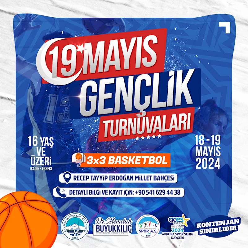 Kayseri Büyükşehir Belediyesi Spor A.Ş., 19 Mayıs Atatürk’ü Anma, Gençlik ve Spor Bayramı kutlamaları kapsamında 19 Mayıs Gençlik Turnuvası 3x3 Basketbol etkinliği düzenleyecek.Sporun ve sporcunun dostu Başkan Dr. Memduh Büyükkılıç’ın talimatları doğrultusunda, ‘2024 Yılı Avrupa Spor Şehri’ ünvanına sahip Kayseri’yi sporun merkezi haline getirecek proje ve hizmetlerini hız kesmeden sürdüren Büyükşehir Belediyesi, özel gün ve haftalara özel organizasyonlarla hazırlanmayı da ihmal etmiyor.Bu kapsamda, kültür sanat ve spor alanında özel gün ve haftalara özel spor organizasyonları ile sporseverleri buluşturan Kayseri Büyükşehir Belediyesi, 19 Mayıs Atatürk’ü Anma, Gençlik ve Spor Bayramı dolayısıyla 19 Mayıs Gençlik Turnuvaları düzenliyor.Büyükşehir Belediyesi Spor A.Ş. tarafından 18-19 Mayıs 2024 tarihleri arasında 19 Mayıs Gençlik Turnuvası 3x3 Basketbol etkinliği düzenlenecek.Recep Tayyip Erdoğan Millet Bahçesi’nde gerçekleşecek 3x3 Basketbol turnuvası için kayıtlar başladı.16 yaş ve üzerinin katılabileceği ve kontenjanının sınırlı olduğu turnuvaya ilişkin detaylı bilgi 0 (541) 629 44 38 nolu telefondan alınabilecek.