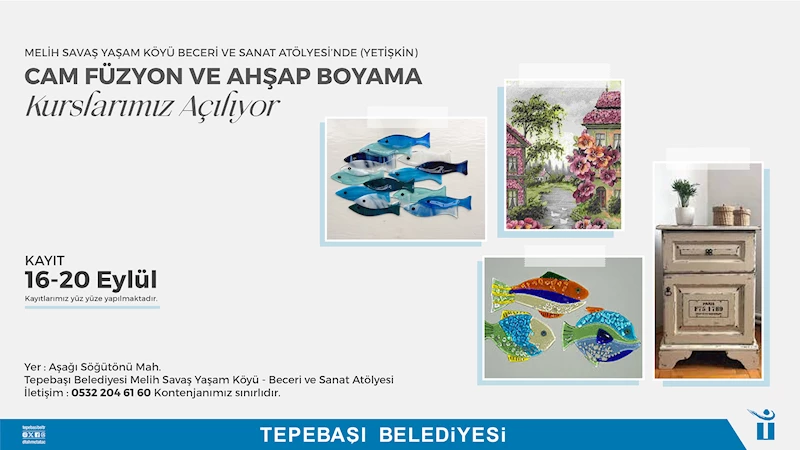 Melih Savaş Yaşam Köyü’nde bulunan Beceri ve Sanat Atölyelerinde düzenlenecek olan yetişkin grubu cam füzyon ve ahşap boyama kursları için de kayıtlar 16-20 Eylül tarihleri arasında alınacak. Kayıt işlemleri ise yüz yüze yapılacak.