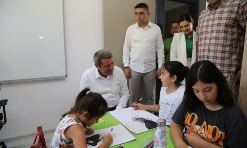Manisa Büyükşehir Belediyesi Genel Sekreter Yardımcısı Ergün Aksoy ve Başkan Danışmanı Nursel Ustamehmetoğlu, Akhisar’a yeni kazandırılan Çocuk Kültür Sanat Merkezi ile yaz okulu uygulamasıyla hazırlık kurslarına devam eden MABEM’de öğrencilerle bir araya geldi.