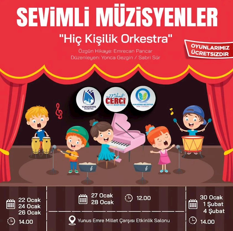 Yunus Emre Millet Çarşısı’nda izleyici ile buluşacak olan “Sevimli Müzisyenler Hiç Kişilik Orkestra” tiyatro oyunu 22, 24 ve 26 Ocak tarihlerinde saat 14.00’de, 27 ve 28 Ocak’ta ise saat 12.00’de sahnelenecek. 30 Ocak, 1 Şubat ve 4 Şubat’ta 14.00’de izleyiciyle buluşacak.