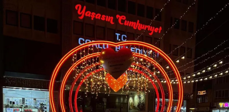 Çorlu Belediyesi, 14 Şubat Sevgililer Günü öncesinde kentin işlek cadde ve meydanlarını dekoratif süslemelerle donattı. Belediyenin öz kaynaklarıyla hazırlanan süslemeler, şehrin simge noktalarını fotoğraf tutkunları için cazibe merkezi haline getirdi.